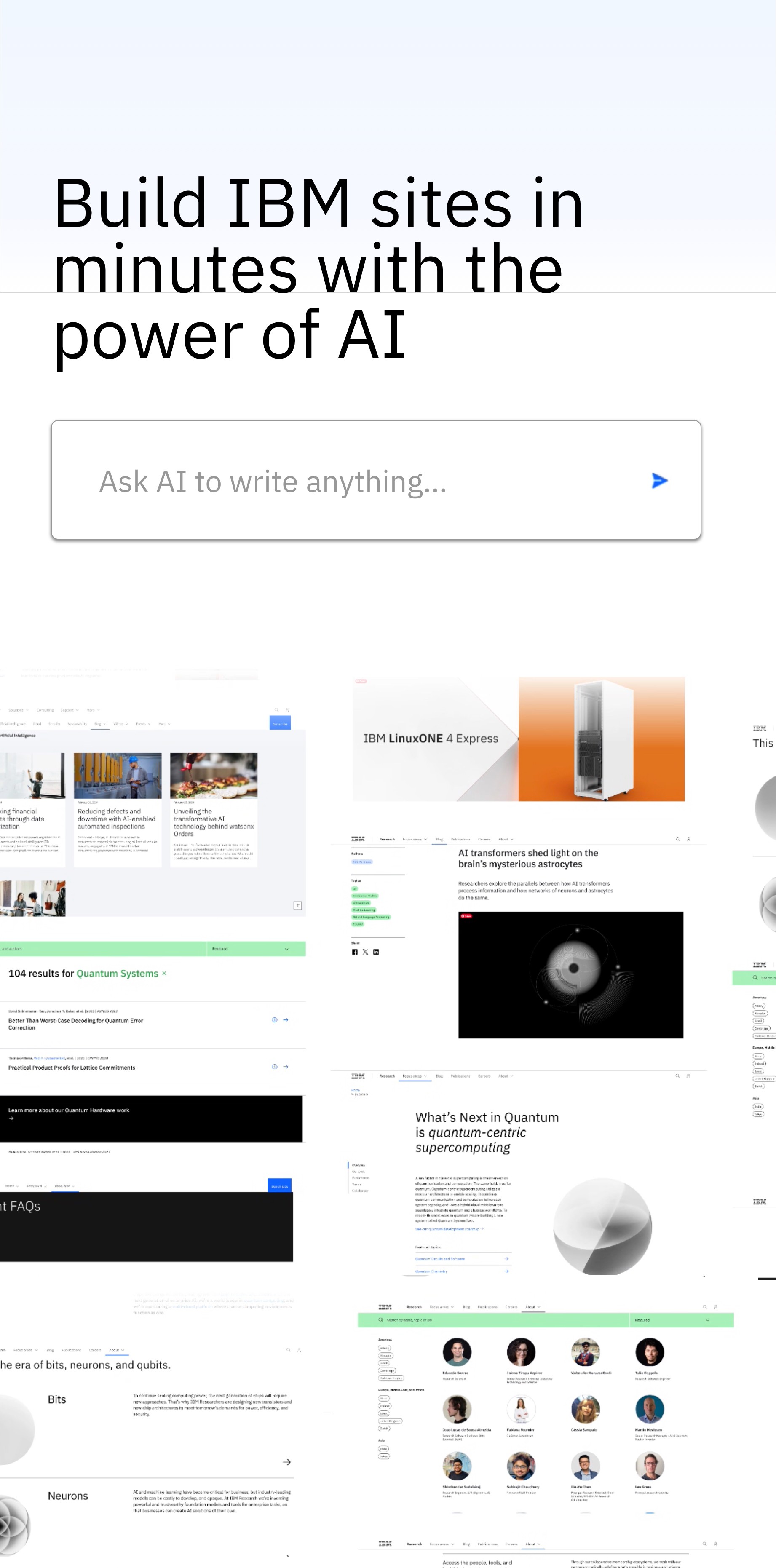 As part of the design team for IBM’s AI & Automation and Data department, I explored how internal teams could more easily publish content using AI with decreased reliance on engineering. This project aimed to reduce friction, improve internal collaboration, and deliver high-quality sites that adhere to IBM’s design standards.